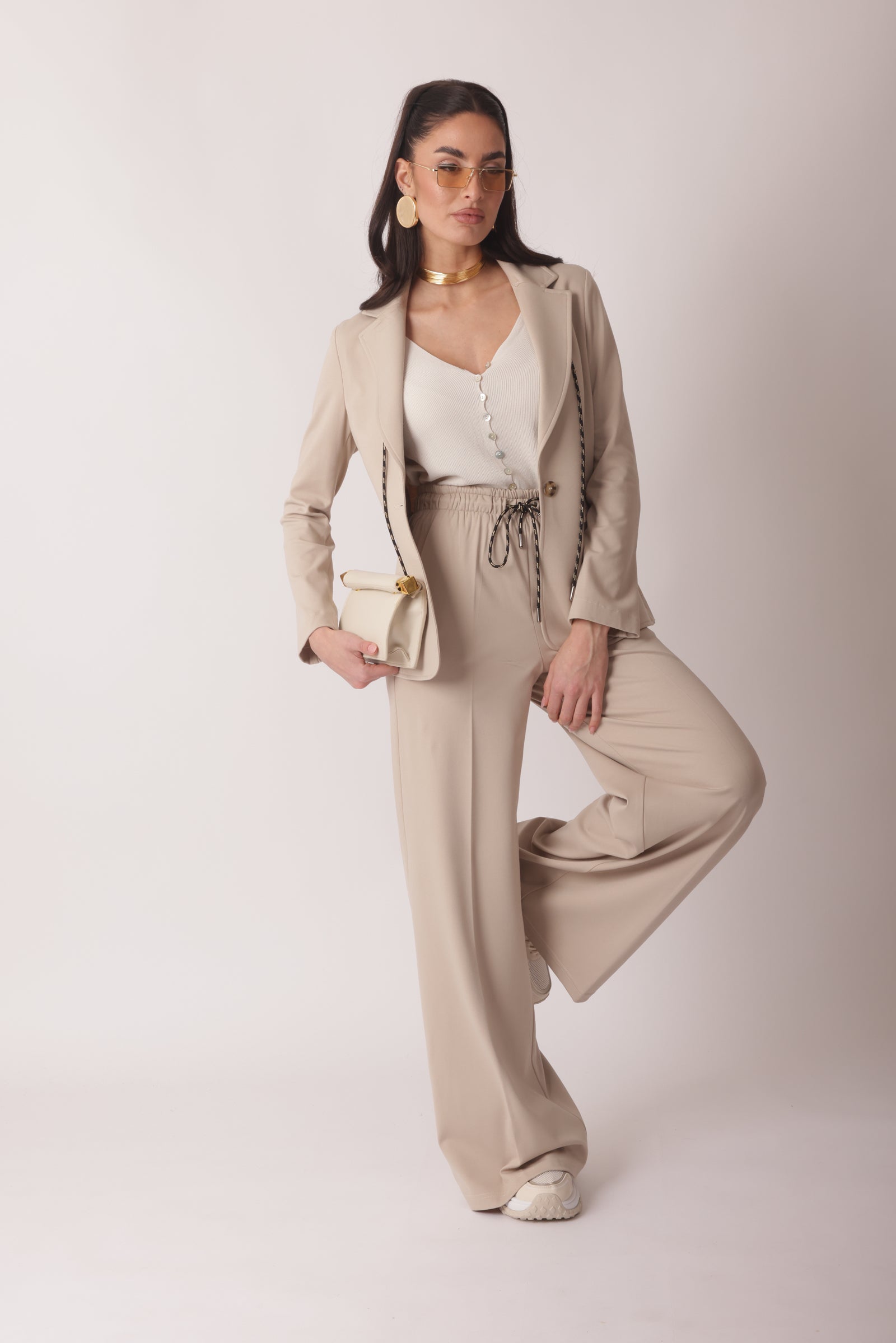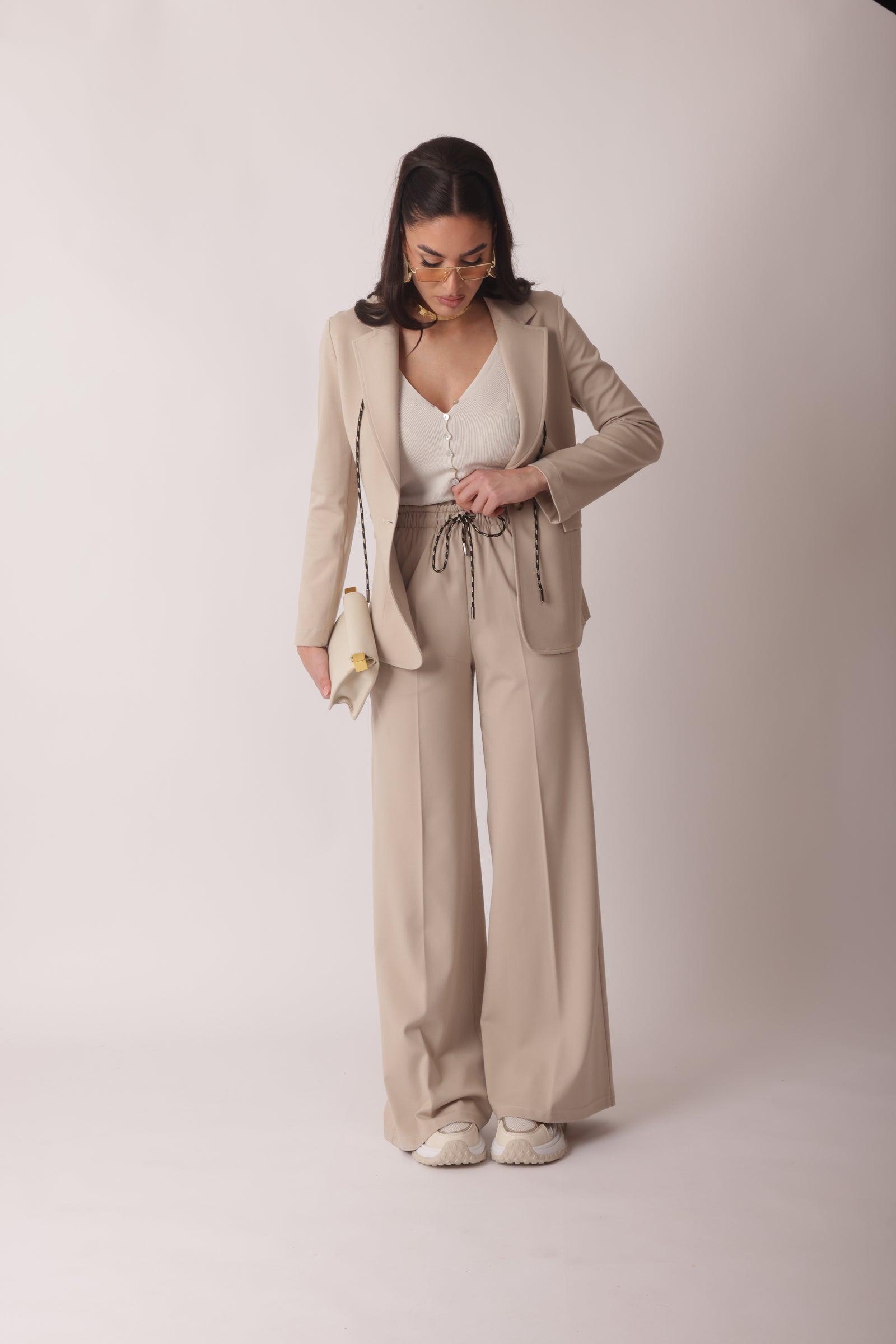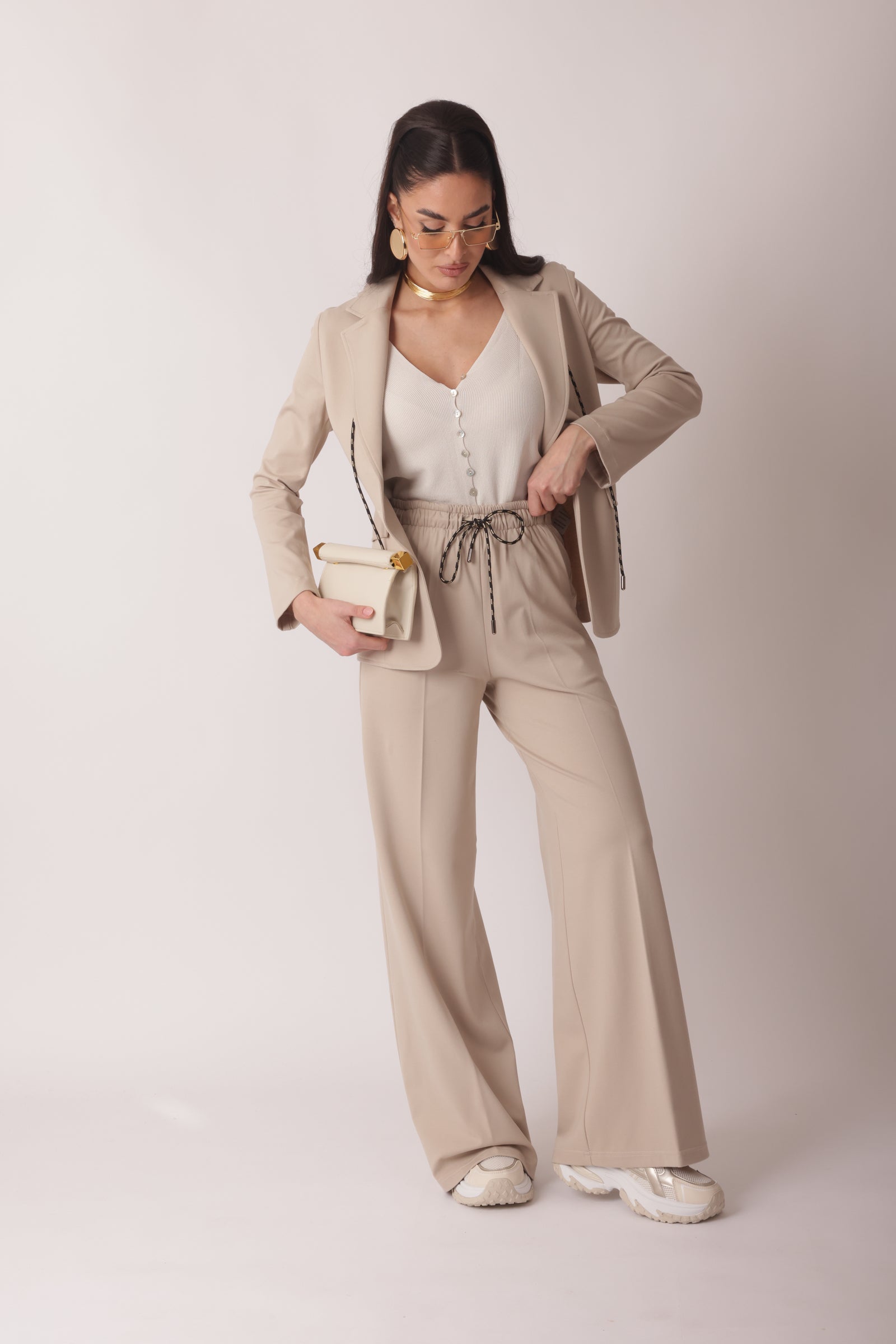 - Dettagli: elastico in vita, tasche laterali e coulisse;