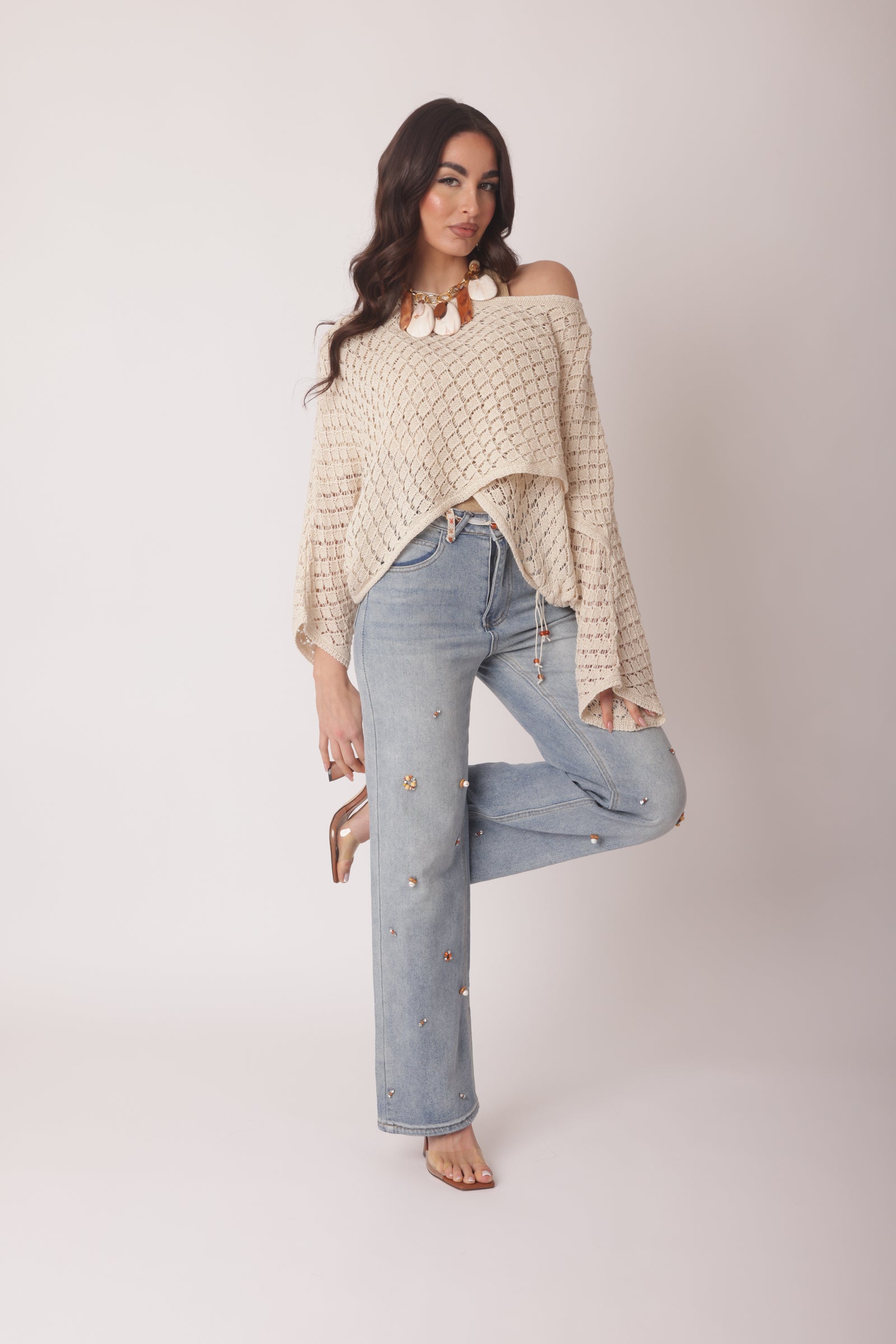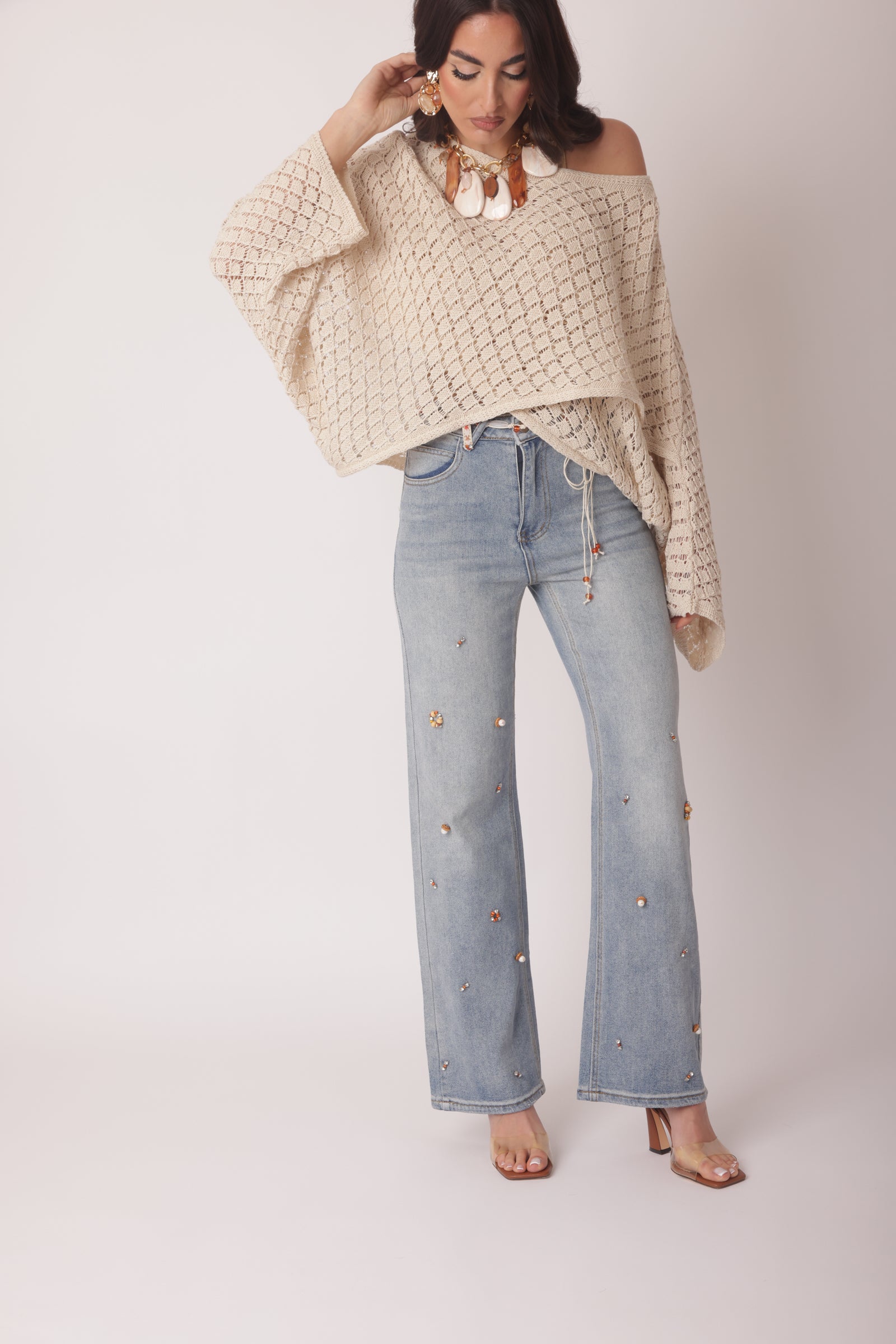- Dettagli: 5 tasche, strass e perline;